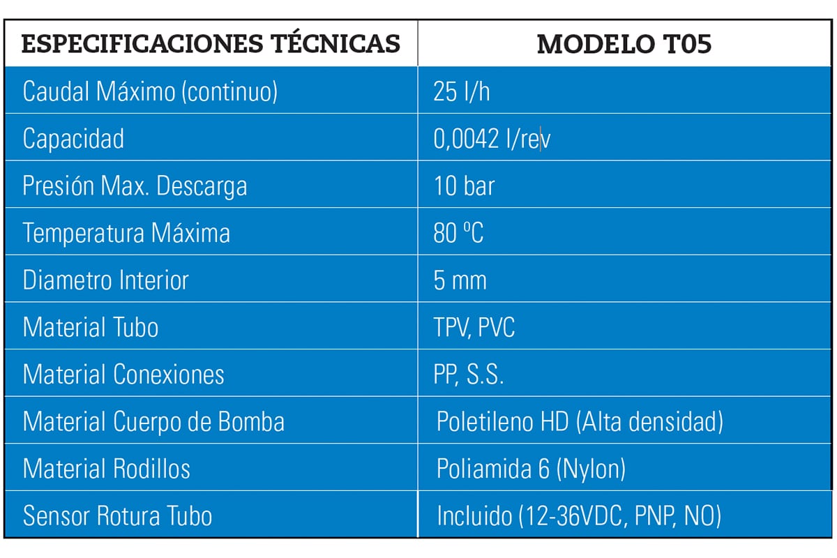 El cuerpo de la bomba peristáltica está fabricado en Polietileno de alta densidad y es totalmente estanco, lo que hace que el riesgo de fugas sea mínimo. Cuenta con un sensor de rotura de tubo incluido en su versión estándar.