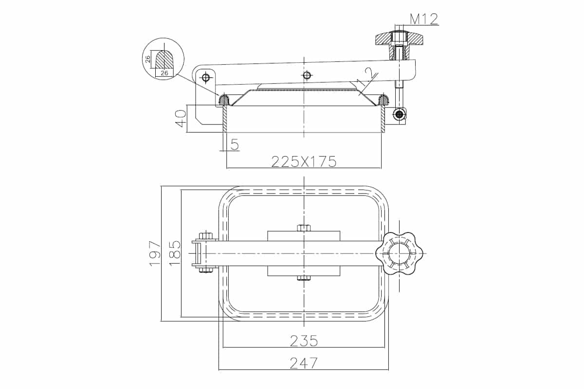 Puerta inoxidable rectangular con apertura horizontal exterior.