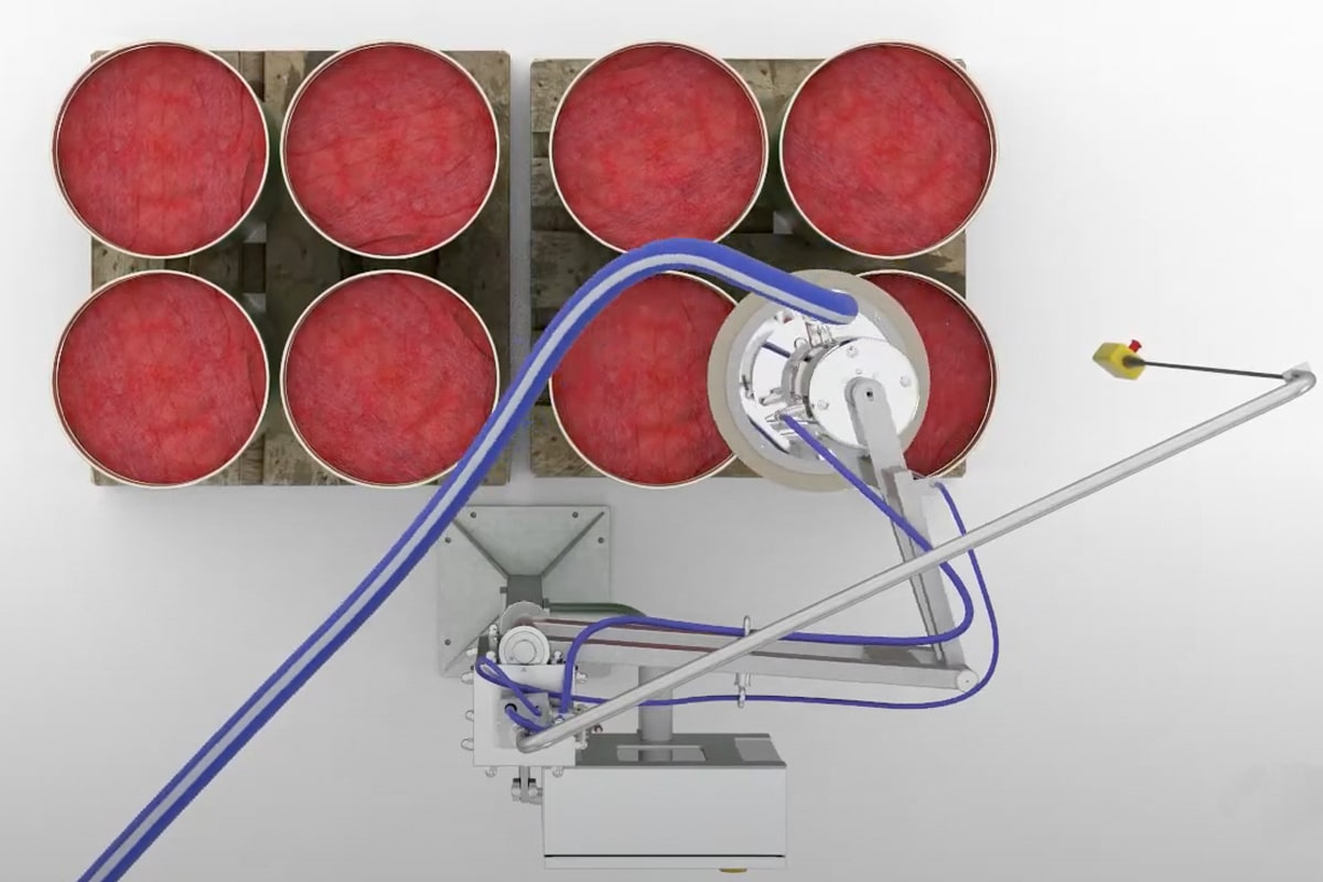 El sistema con PLC automatiza el proceso de vaciado y es adaptable a diferentes formatos, como por ejemplo bidones estándar de 220 kilos o bidones de volúmenes especiales.