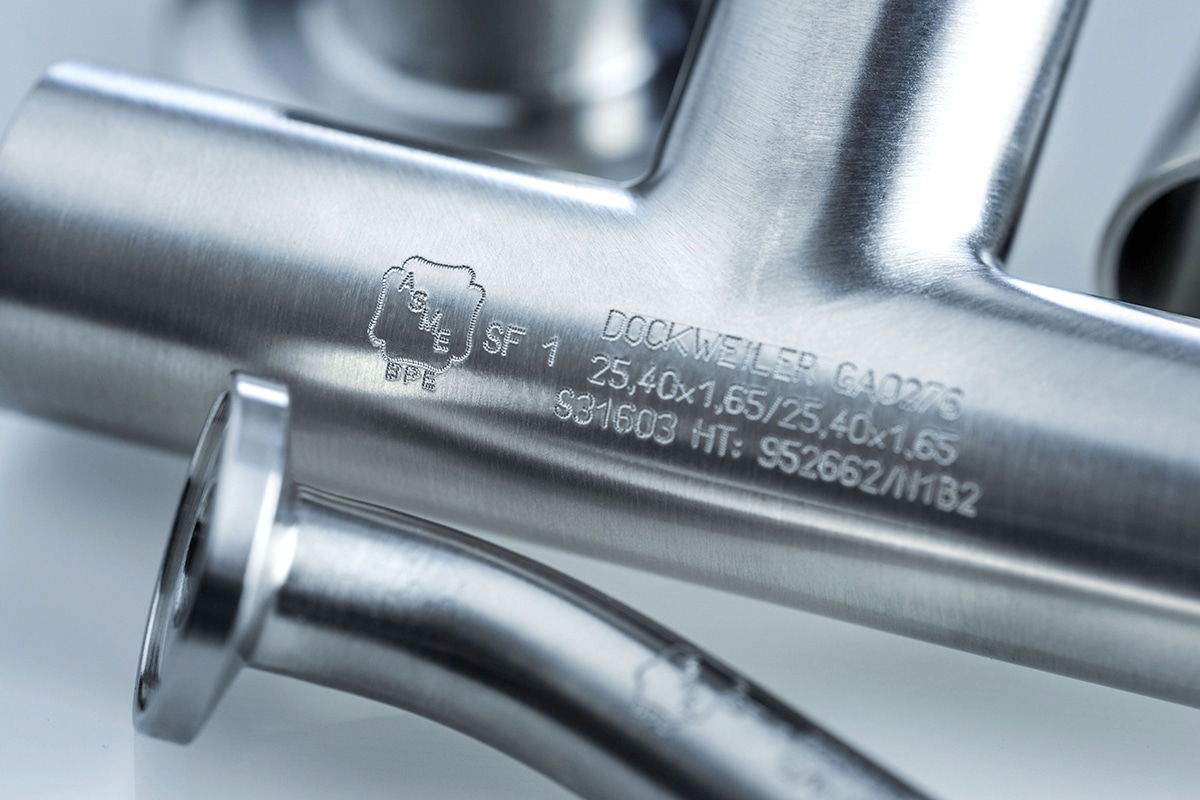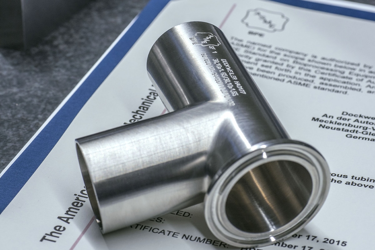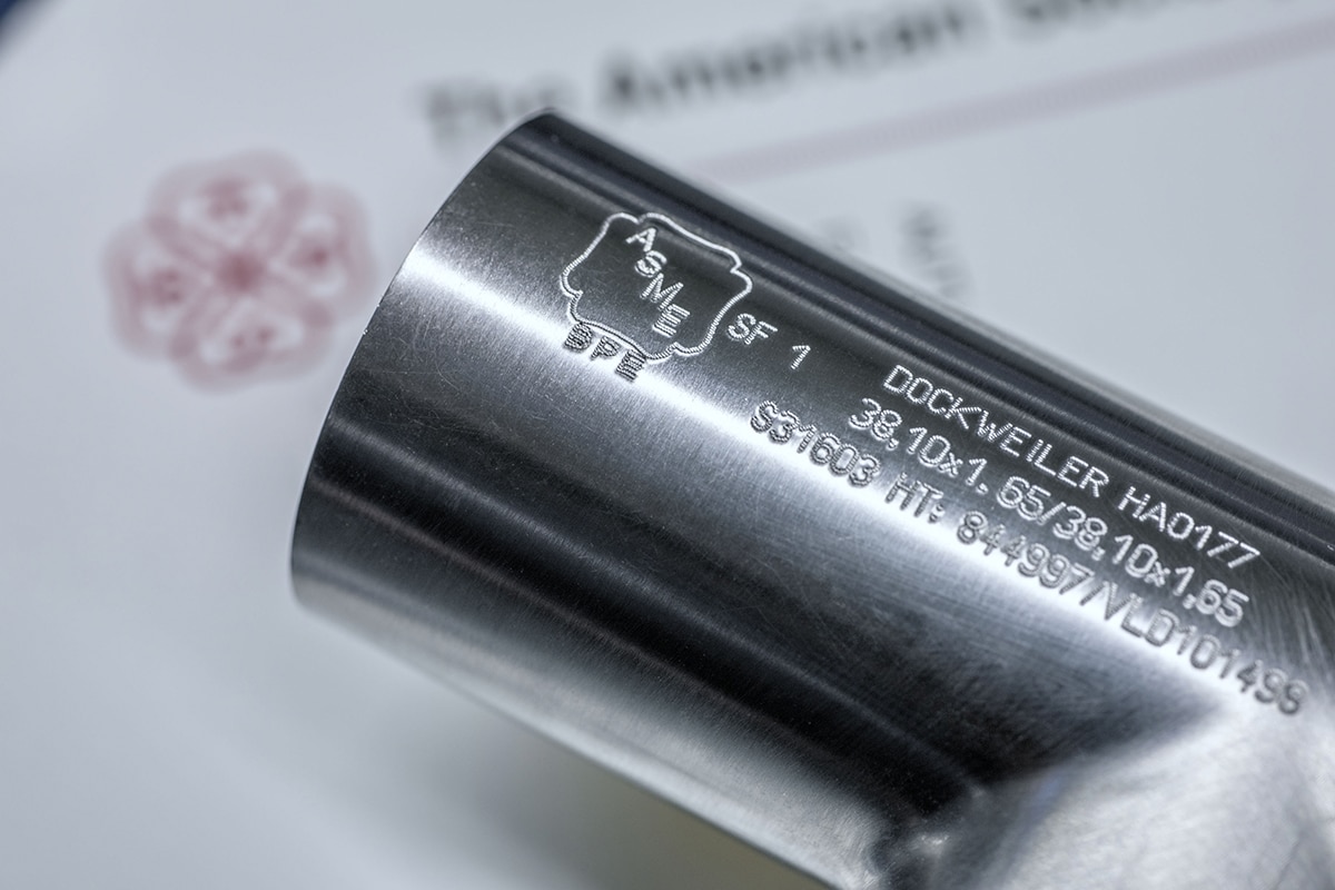 Los productos Dockweiler son los únicos certificados en el mundo como ASME-BPE en materiales especiales como C22 y AL-6XN. Todos tubos y fittings están disponibles en versiones con acabado brillante o electropulido y marcados con el logotipo ASME.